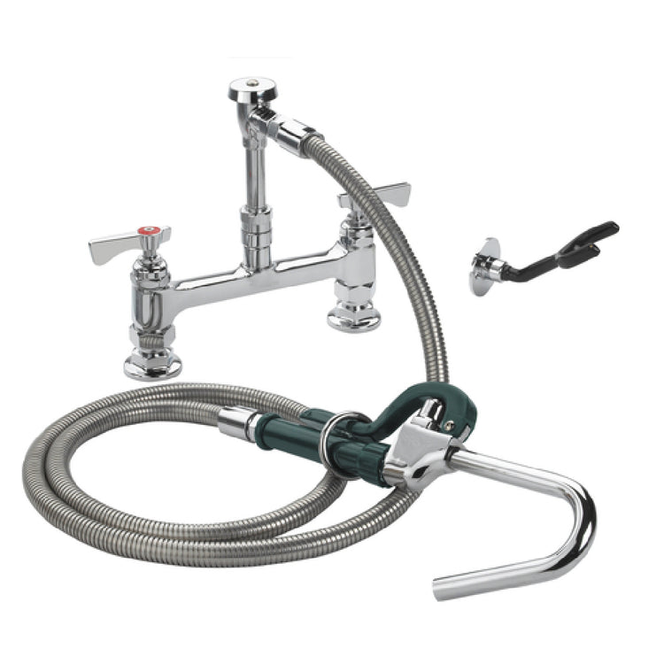 The Krowne 20-208L Krowne Royal Series Pot Filler Assembly Deck Mount 8" Adjustable Centers is a versatile tool designed for professional kitchens and culinary establishments requiring efficient water access. Featuring 8" adjustable centers, it provides flexibility in installation, accommodating various space requirements. The product is equipped with a 72" long stainless steel flexible hose, complete with a pot hook valve, enhancing its utility and reach across larger spaces. A plastic-coated wall hook ensures secure storage when not in use, safeguarding both the hose and surrounding surfaces. Engineered with a vacuum breaker and built-in check valves, this pot filler assembly prevents backflow and cross-contamination, maintaining high standards of water safety and hygiene. It includes 1/2" NPT male inlets, facilitating straightforward integration with existing plumbing systems, and a mounting kit for hassle-free installation. The Krowne 20-208L adheres to low lead compliance standards and is NSF certified, emphasizing its commitment to health and safety regulations. This pot filler assembly is particularly advantageous for commercial kitchens, enhancing workflow efficiency by providing a reliable, safe, and adaptable water dispensing solution that meets diverse culinary and operational needs.