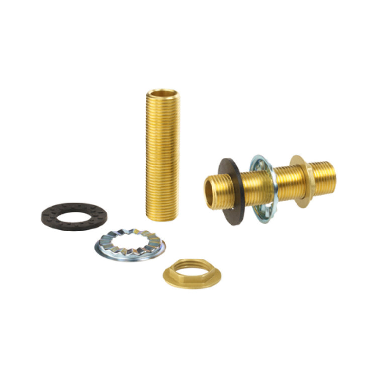 The Krowne 21-196L Royal Series Deck Mounting Kit Long Style is a specialized plumbing accessory that caters to the needs of professional kitchens and bar environments requiring reliable fixture installations. This kit comprises two 3-1/2 inch brass nipples, which are engineered for durability and longevity, ensuring a secure connection between deck-mounted faucets and water lines. Accompanying these brass nipples are two brass locknuts and two brass washers, which provide a stable and leak-proof seal, essential for preventing water damage and maintaining operational efficiency. The use of brass material in these components is a testament to the kit's robust construction, offering corrosion resistance and strength under high-pressure conditions. The long style configuration of this mounting kit is particularly beneficial for applications requiring extended reach, making it an ideal choice for establishments with unique spatial requirements or those seeking enhanced versatility in their plumbing setups. The Krowne 21-196L mounting kit is suitable for a variety of industry segments, from hospitality to restaurant and bar operations, where quality and reliability are paramount. Its design not only supports functional excellence but also facilitates seamless installation, underscoring its role as a vital component in professional plumbing solutions.