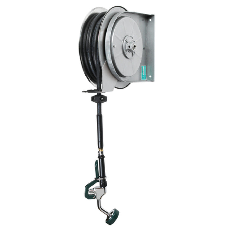 The Krowne 24-603 Krowne Royal Series Pre-Rinse Hose Reel Assembly is a meticulously designed open gray powder coated hose reel, essential for efficient and hygienic kitchen operations. This assembly stands out for its durable construction and sleek powder-coated finish, which not only enhances its aesthetic appeal but also ensures resistance to rust and corrosion. The open design allows for easy access and maintenance, making it highly suitable for fast-paced environments where cleanliness and efficiency are paramount. Whether utilized in restaurants, hotels, or catering services, this product meets diverse needs across various sectors of the food industry by providing a reliable and long-lasting solution for pre-rinse tasks. Its robust build caters to heavy-duty usage, ensuring that it withstands the demands of high-volume commercial kitchens. The Krowne 24-603 promises to streamline workflow by facilitating quick and effective rinsing operations, thus enhancing productivity and maintaining high standards of hygiene. With its focus on quality and performance, this hose reel assembly is an indispensable tool for any professional kitchen aiming to optimize its cleaning and rinsing processes.