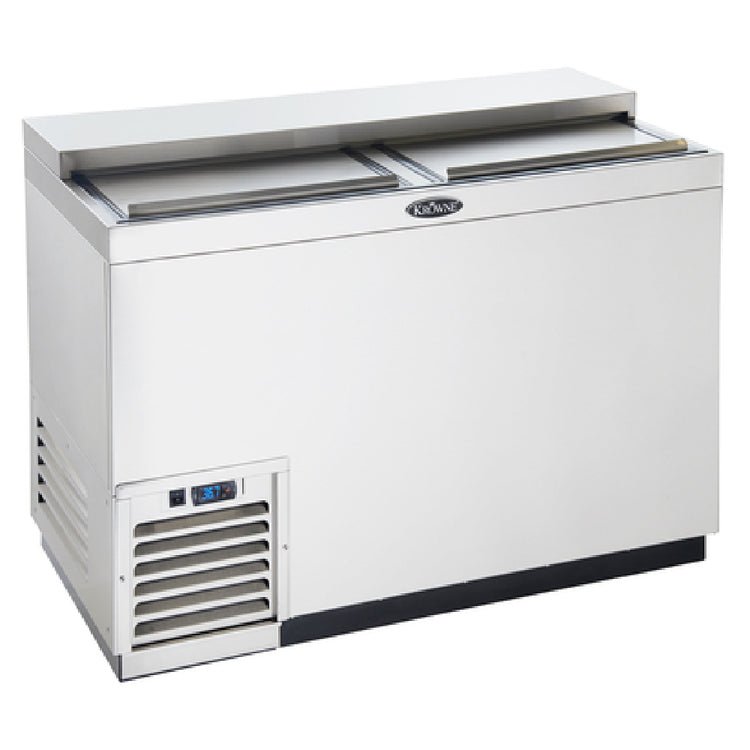 The Krowne BC48-SS Bottle Cooler is a high-capacity refrigeration unit tailored for professionals in the beverage industry, offering a robust solution with its flat top design measuring 48 inches in width and 24 inches in depth. This cooler is engineered for efficiency with its self-contained refrigeration system, capable of accommodating up to 15.5 cases of 12oz bottles. It features two sliding lids for easy access and includes two adjustable chrome-plated divider racks, providing flexible storage options. The digital thermostat ensures precise temperature control, while the built-in condensate evaporator enhances its operational efficiency. Both the interior and the exterior front and sides are constructed from stainless steel, offering durability and a sleek appearance. Utilizing the environmentally friendly R290 Hydrocarbon refrigerant, this cooler is powered by a 1/3 HP motor, operating at 115v/60/1-ph with a current draw of 2.18 amps, and it comes equipped with a cord featuring a NEMA 5-15P plug. It is certified by NSF7 and ETL-Sanitation, making it a reliable and compliant choice for bars, restaurants, and hospitality businesses seeking a high-performing and sustainable refrigeration solution.