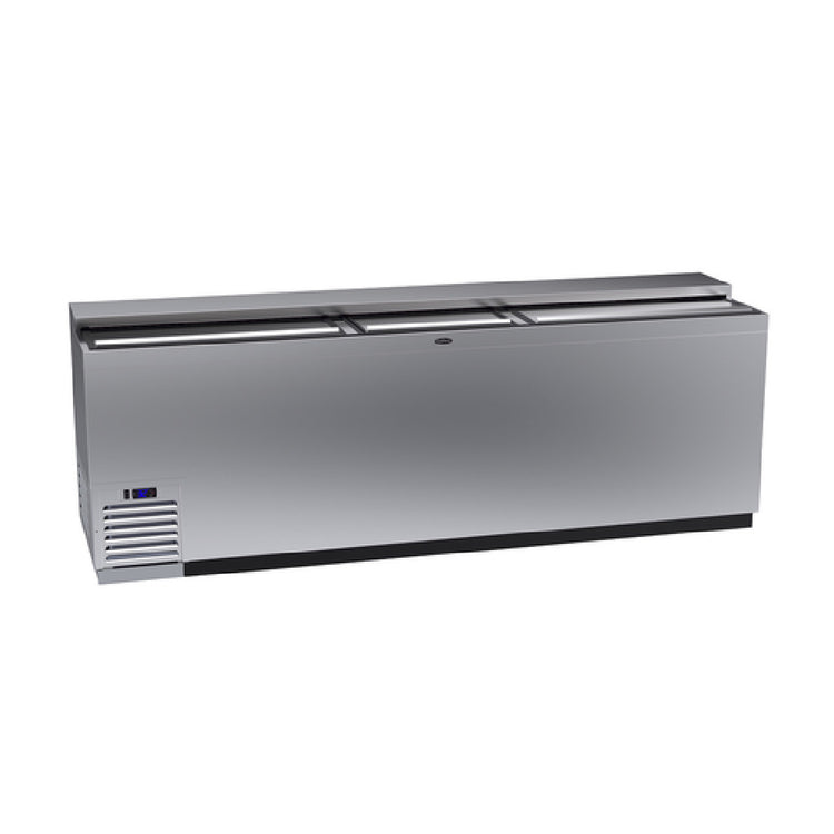 The Krowne BC96-SS Bottle Cooler is a high-capacity, flat-top refrigeration unit measuring 96"W x 24"D, perfect for hospitality environments that require efficient beverage storage and cooling. This model can accommodate up to 37 cases of 12oz bottles, ensuring ample supply for high-demand situations. It features three sliding lids for easy access and five adjustable chrome-plated divider racks, allowing customizable storage configurations to suit various needs. The built-in digital thermostat provides precise temperature control, maintaining optimal cooling conditions. This bottle cooler is designed with a stainless steel interior and exterior front and sides, offering durability and a sleek, professional appearance. Equipped with a 1/3 HP compressor and utilizing R290 Hydrocarbon refrigerant, the unit is both powerful and environmentally friendly. Operating at 115v/60/1-ph with a current draw of 2.71 amps, it includes a cord with NEMA 5-15P plug for straightforward installation. Additionally, the cooler features a condensate evaporator to manage excess moisture efficiently. Certified with NSF7 and ETL-Sanitation standards, the Krowne BC96-SS prioritizes hygiene and safety, making it an excellent choice for bars, restaurants, and any establishment committed to maintaining high standards of beverage storage and service quality.