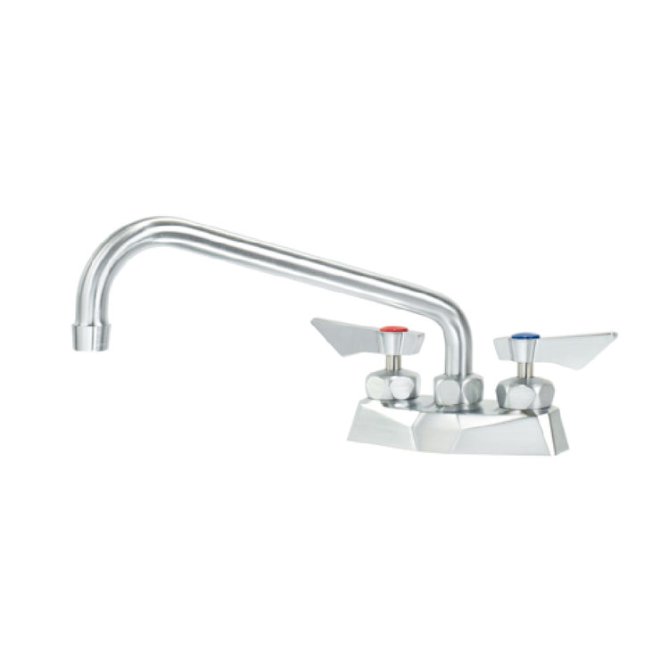 The Krowne DX-310 Krowne Diamond Series Faucet Deck Mount 4" Centers is a high-performance faucet designed for precision and durability, ideal for various professional environments. Featuring a 10" swing spout, this faucet ensures flexibility and reach, accommodating different needs in busy kitchens. With a flow rate of 1.8 gallons per minute, the faucet balances efficiency and water conservation. Constructed with a solid chrome-plated brass base, it boasts an ultra-polish satin finish, enhancing both durability and aesthetic appeal. The faucet is equipped with lever handles and a stainless steel 1/4 turn high-performance ceramic cartridge valve, which includes an integral check valve to prevent cross-contamination. It connects with a 1/2" NPT male and includes two 3/8" stainless steel braided flexible supply hoses, ensuring robust and reliable connections. The package also includes 1/2" NPT close elbows with swivel compression fittings on the faucet side and a 3/8" compression fitting on the water supply side, along with mounting nipples, washers, and lock nuts. The product is backed by a lifetime warranty, a testament to its quality and endurance. NSF and CSA certifications further underscore its compliance with rigorous standards, making it a trusted choice for restaurants, hotels, and other hospitality sectors.