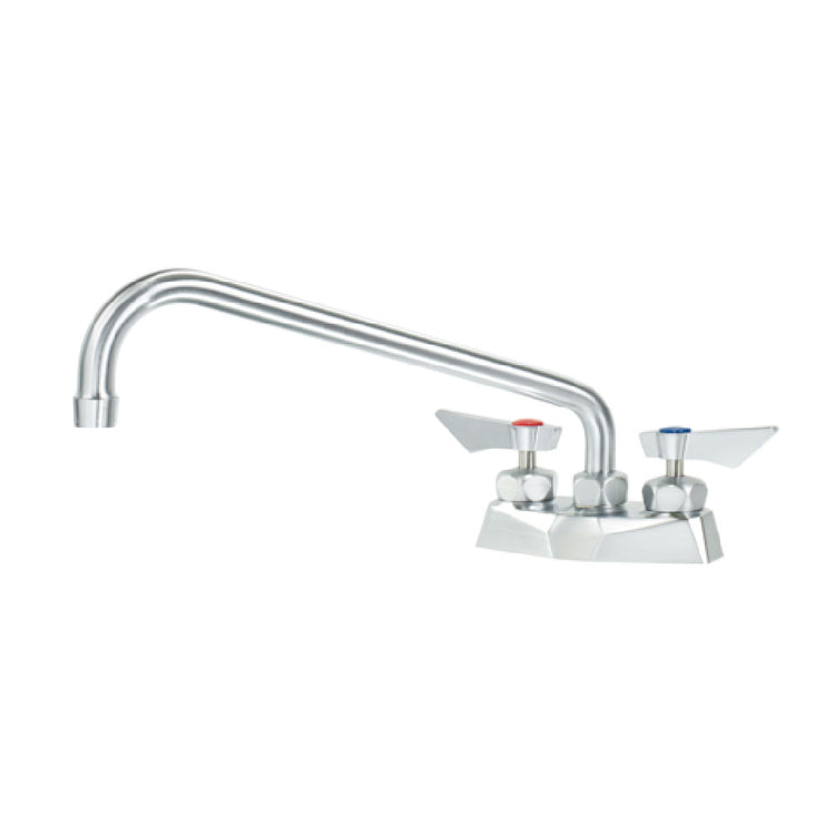The Krowne DX-312 Krowne Diamond Series Faucet Deck Mount 4" Centers is a precision-engineered fixture ideal for commercial settings, bringing together durability and efficiency. It features a 12" swing spout and a 1.8GPM aerator, ensuring optimal water flow for diverse applications. This faucet is constructed with a solid chrome-plated brass base, complemented by an ultra-polish satin finish, enhancing both resilience and aesthetic appeal. Equipped with lever handles, it utilizes stainless steel 1/4 turn high-performance ceramic cartridge valves complete with integral check valves, effectively preventing cross-contamination. The faucet connects via 1/2" NPT male fittings and includes two 3/8" stainless steel braided flexible supply hoses. Installation is made straightforward with the inclusion of 1/2" NPT Close elbows featuring swivel compression fittings on the faucet side and 3/8" compression fittings on the water supply side. Additional components such as mounting nipples, washers, and lock nuts ensure secure and reliable setup. With a LIFETIME WARRANTY, the Krowne DX-312 is certified by NSF and CSA, affirming its compliance with stringent industry standards. This faucet is an exceptional solution for establishments that prioritize both function and reliability in their plumbing fixtures.