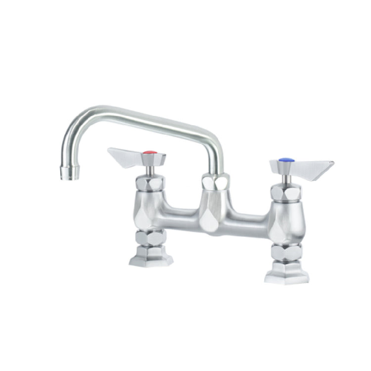 The Krowne DX-906 Krowne Diamond Series Faucet - Raised Deck Mount 8" Centers is a premium fixture designed for efficiency and durability in commercial and industrial settings. Featuring an 8-inch center and a 6-inch swing spout, it utilizes a 1.8GPM aerator to ensure optimal water flow while maintaining water conservation standards. The ultra-polish satin finish and solid chrome-plated brass base provide a sleek and robust appearance, making it an excellent addition to any professional workspace. Equipped with lever handles and stainless steel 1/4 turn high-performance ceramic cartridge valves, this faucet includes integral check valves to prevent cross-contamination, enhancing safety and functionality. The Krowne DX-906 features a 1/2" NPT male connection and includes two 3/8" stainless steel braided flexible supply hoses, along with 1/2" NPT close elbows with swivel compression fittings on the faucet side and a 3/8" compression fitting on the water supply side. For ease of installation, it comes complete with mounting nipples, a washer, and lock nuts. Certified by NSF and CSA, this faucet offers a lifetime warranty, ensuring long-term reliability and performance in demanding environments. Its precision engineering and comprehensive features make it ideal for a variety of markets within the plumbing and hospitality industries.