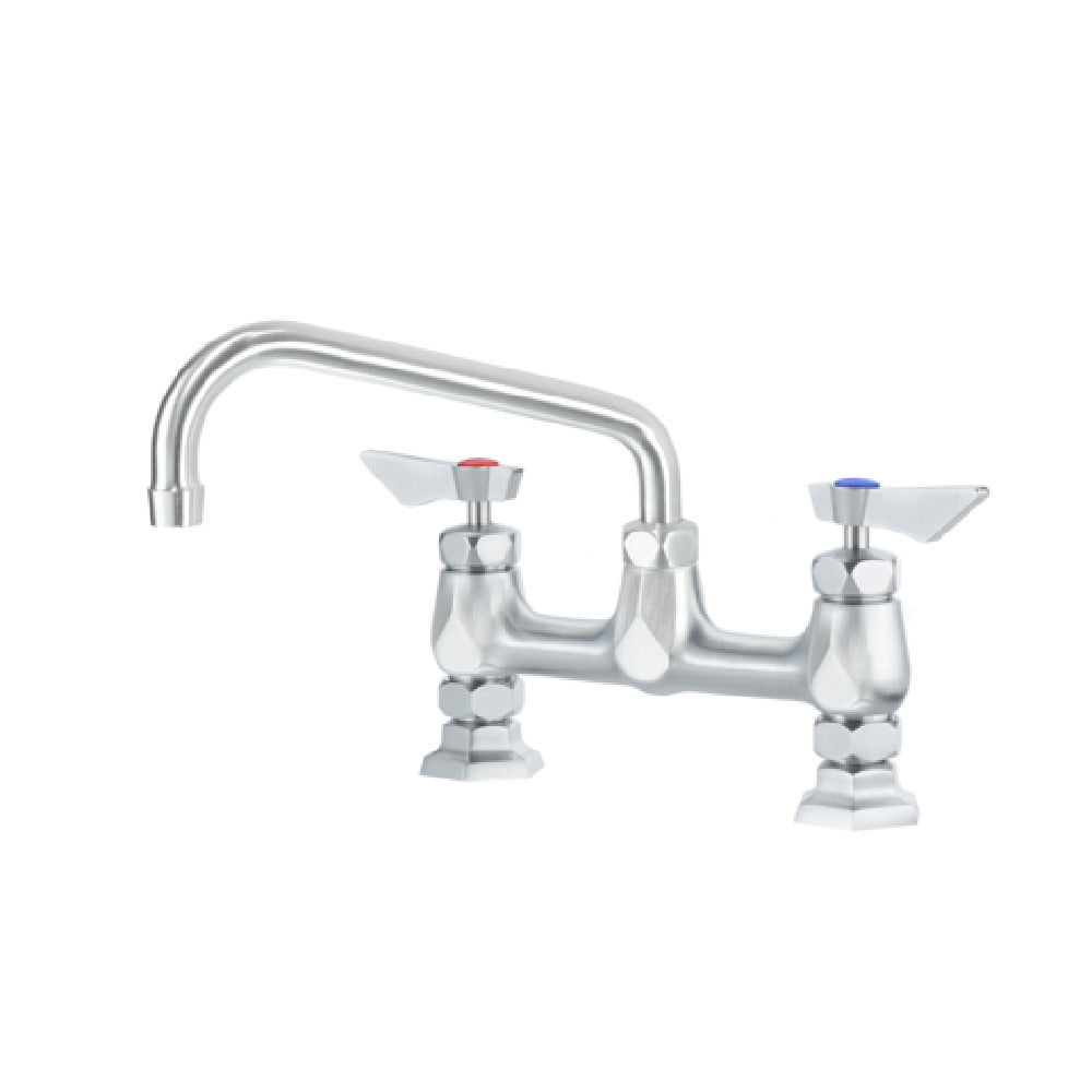 The Krowne DX-908 Krowne Diamond Series Faucet - Raised Deck Mount - 8" Centers is a premium fixture designed for high-performance environments within the hospitality and foodservice industries. Featuring an 8" swing spout, this faucet is engineered to deliver a steady flow rate of 1.8GPM, facilitated by an ultra-polish satin finish that enhances both aesthetics and durability. The faucet's solid chrome-plated brass base ensures long-lasting performance, complemented by lever handles for smooth operation. Innovative stainless steel 1/4 turn high-performance ceramic cartridge valves are included, equipped with integral check valves to prevent cross-contamination, a crucial feature for maintaining sanitary conditions. Designed for easy installation, the DX-908 comes with 1/2" NPT male fittings, two 3/8" stainless steel braided flexible supply hoses, 1/2" NPT close elbows with swivel compression fittings on the faucet side, and a 3/8" compression fitting on the water supply side. The package also includes mounting nipples, a washer, and lock nuts to ensure a secure fit. Certified by NSF and CSA, this faucet is backed by a lifetime warranty, making it a reliable choice for professionals who prioritize safety, efficiency, and longevity in demanding operational settings.