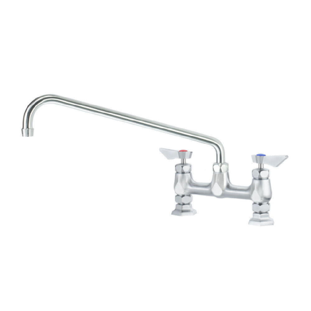 The Krowne DX-916 Krowne Diamond Series Faucet is a precision-engineered raised deck mount fixture designed for versatile use in professional settings. This faucet features an 8-inch center installation and is equipped with a 16-inch swing spout, delivering a 1.8 gallons-per-minute flow through its high-efficiency aerator. Constructed with a robust solid chrome-plated brass base, it boasts an ultra-polished satin finish that enhances both durability and aesthetic appeal. Lever handles provide ease of use, while the stainless steel 1/4-turn high-performance ceramic cartridge valves include an integral check valve to prevent cross-contamination, ensuring a safe and clean water supply. The Krowne DX-916 comes with dual 3/8-inch stainless steel braided flexible supply hoses and includes 1/2-inch NPT close elbows with swivel compression fittings on the faucet side and a 3/8-inch compression fitting on the water supply side. It is installed with mounting nipples, a washer, and lock nuts. This model is backed by a lifetime warranty and is NSF and CSA certified, making it an ideal choice for commercial kitchens, restaurants, and food service environments where reliability and compliance with health standards are paramount.