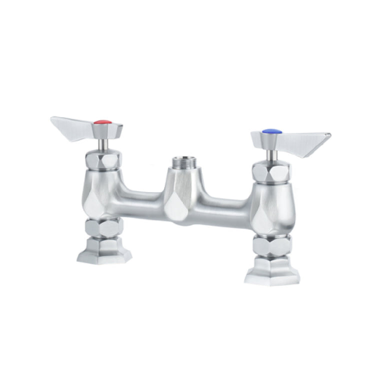The Krowne DX-9XX Krowne Diamond Series Faucet Raised Deck Mount Body Only is a premium fixture designed to meet the exacting needs of both commercial and residential applications. Engineered with an ultra-polish satin finish, it features a solid chrome-plated brass base that ensures durability and a sleek appearance. This faucet includes lever handles and high-performance stainless steel 1/4 turn ceramic cartridge valves, which incorporate integral check valves to prevent cross-contamination, highlighting its advanced technology. The unit is equipped with two 3/8" stainless steel braided flexible supply hoses, offering flexibility and ease of installation. Its connection dimensions are 1/2" NPT male, with included 1/2" NPT close elbows featuring swivel compression fittings on the faucet side and 3/8" compression fittings on the water supply side. The package also includes mounting nipples, a washer, and lock nuts for secure installation. The Krowne DX-9XX is backed by a lifetime warranty, reinforcing its commitment to quality and reliability. Certified by NSF and CSA, this faucet is an excellent choice for those seeking a high-performance, reliable, and efficient plumbing solution for their kitchen or bathroom environments.
