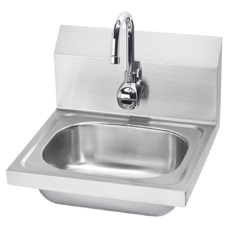 The Krowne HS-11 Hand Sink Wall Mount is a compact, robust solution specifically designed for high-demand environments where sanitation and space efficiency are crucial. Measuring 15-3/4 inches wide, 15-1/4 inches deep, and 13-3/8 inches in overall height, this hand sink is engineered for wall mounting, making it an ideal option for commercial kitchens, healthcare facilities, and other industrial settings. Key features include a 7-3/4 inch high backsplash that helps prevent water splashes from contacting the wall, maintaining cleanliness and hygiene. The bowl, with dimensions of 12-1/2 inches wide by 9-3/4 inches front-to-back and 5-5/8 inches deep, provides adequate space for thorough handwashing. Its splash mount electronic gooseneck faucet is low lead compliant, promoting safety and health standards. This model comes with a mounting bracket and rear overflow, enhancing ease of installation and functionality. Crafted from durable stainless steel, the Krowne HS-11 ensures longevity and resistance to corrosion, while its NSF certification attests to its compliance with rigorous public health and safety standards. This hand sink is a valuable addition to any space demanding high hygiene standards and efficient use of space, making it a reliable choice across various industry segments.