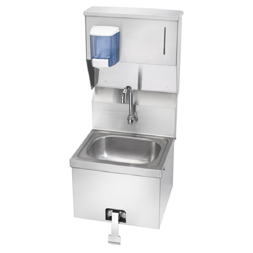 The Krowne HS-16 Hand Sink is a wall-mounted unit designed for efficient use in commercial settings. This hand sink boasts dimensions of 16-3/16 inches in width, 15-1/4 inches in depth, and 33-1/2 inches in overall height, fitting seamlessly into various workspaces. The sink features an 8-inch high backsplash, providing effective splash protection. The bowl measures 12-1/2 inches wide, 9-3/4 inches front-to-back, and 5-5/8 inches deep, offering ample space for handwashing. A splash mount gooseneck spout with knee pedal valves ensures low lead compliance, promoting user safety and ease of operation. The front and sides are adorned with a stainless steel skirt, enhancing both durability and aesthetic appeal. Complementing the handwashing experience, the sink is equipped with a soap and towel dispenser. It includes a mounting bracket for secure installation. Constructed entirely of stainless steel, the Krowne HS-16 guarantees longevity and resistance to corrosion. Certified by NSF, it meets stringent public health and safety standards, making it a reliable choice for businesses in the foodservice industry, healthcare facilities, and other professional environments that demand high standards of hygiene and efficiency.
