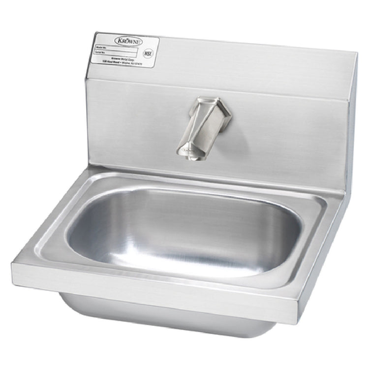 The Krowne HS-69 Hand Sink is a wall-mounted unit with dimensions of 15-3/4 inches in width, 15-1/4 inches in depth, and 13-3/8 inches in overall height. It features a 7-3/4-inch high backsplash, providing added protection against water splashes. The sink is equipped with a bowl measuring 12-1/2 inches wide, 9-3/4 inches front-to-back, and 5-5/8 inches deep, offering ample space for efficient handwashing. A standout feature of this hand sink is its single hole electronic faucet, which enhances convenience and promotes hygiene in commercial settings. Constructed from durable stainless steel, the Krowne HS-69 is designed for longevity and ease of maintenance, making it a reliable choice for environments such as restaurants, healthcare facilities, and food service operations where sanitation is paramount. The NSF certification further underscores its compliance with health and safety standards, assuring users of its quality and reliability. The Krowne HS-69 Hand Sink is ideal for different segment markets in the industry, providing a blend of functionality and durability, essential for high-demand applications requiring robust hygiene solutions.