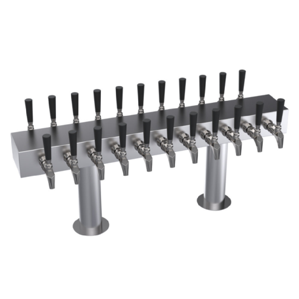 The Krowne KDSTC-11S Krowne Double Sided T-Head Tower is a versatile and robust solution featuring twenty-two faucet slots, designed specifically for commercial settings where high-volume beverage dispensing is required. With handles and faucets not included, this allows for customization tailored to specific operational needs. The tower measures an overall length of 36 inches, providing ample space for efficient service in bustling environments. Engineered with glycol cooling technology, it ensures beverages are served at the optimal temperature, enhancing customer satisfaction. The brushed stainless steel finish not only provides a sleek, modern aesthetic but also offers durability and resistance to wear, making it well-suited for the demands of continuous use in bars, restaurants, and hospitality venues. Its double-sided design maximizes efficiency, enabling simultaneous service and reducing wait times for patrons. The Krowne KDSTC-11S tower exemplifies a blend of functionality and style, meeting the needs of businesses looking to optimize their beverage service with a reliable and adaptable dispensing system.