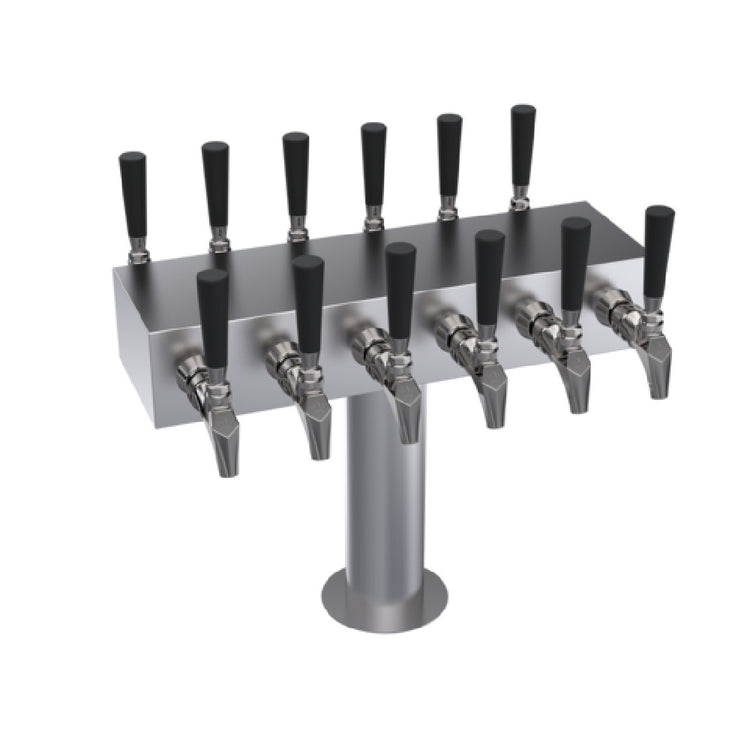 The Krowne KDSTC-6S Krowne Double Sided T-Head Tower is a specialized piece of equipment tailored for businesses requiring a high-capacity beverage dispensing solution. This tower features twelve faucets, providing ample capacity for serving a variety of beverages simultaneously, making it suitable for bars, breweries, and large event venues. The unit has an overall length of 18 inches, offering a compact yet efficient design that fits seamlessly into different service environments. The tower is glycol cooled, a feature that ensures beverages are maintained at an optimal temperature, enhancing the service quality. Constructed with a brushed stainless steel finish, the KDSTC-6S not only offers a sleek and modern aesthetic but also ensures durability and ease of cleaning, which is crucial in high-traffic areas. It is important to note that handles and faucets are not included, allowing businesses to customize these components according to their specific operational needs. The Krowne KDSTC-6S is an ideal choice for establishments that prioritize efficiency and customization in their beverage service solutions, offering a blend of practicality and style in one robust package.