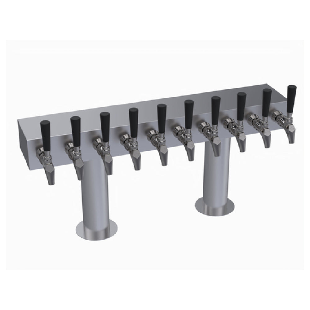 The Krowne KDTH-10S Krowne Double T-Head Tower is a specialized installation designed for high-volume beverage dispensing with a distinctive double T-head configuration. This sturdy unit accommodates ten faucets, though handles and faucets are sold separately, allowing for customization based on individual preferences or venue requirements. Measuring 30 inches in length, the tower is engineered with a glycol-cooled mechanism, ensuring consistent temperature regulation, which is essential for maintaining beverage quality over extended periods. The brushed stainless steel finish not only provides an elegant appearance suitable for upscale environments but also offers durability and resistance to corrosion, making it an ideal choice for bars, restaurants, and hospitality venues that prioritize both form and function. By facilitating efficient beverage dispensing through its multi-faucet design, the Krowne KDTH-10S caters to the needs of establishments serving a variety of beverages simultaneously, enhancing operational efficiency and customer satisfaction. This product's robust construction and technical specifications underscore its suitability for diverse industry segments, emphasizing flexibility and reliability in demanding commercial settings.
