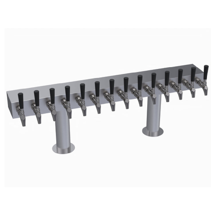 The Krowne KDTH-14S Krowne Double T-Head Tower is a meticulously designed unit tailored for commercial setups that require robust and efficient beverage dispensing solutions. This sophisticated tower accommodates fourteen faucets, making it ideal for high-volume environments such as busy bars, restaurants, and breweries. The unit measures 42 inches in length, providing ample room for diverse beverage selections while maintaining a sleek profile. Notably, the KDTH-14S tower is glycol-cooled, a vital feature that ensures consistent temperature regulation across all dispensing points, essential for maintaining beverage quality and customer satisfaction. Crafted from brushed stainless steel, the tower not only boasts a modern aesthetic but also promises durability and ease of maintenance, crucial for rigorous commercial use. It's important to highlight that handles and faucets are not included with this unit, allowing users the flexibility to customize according to their specific operational needs. Designed for precision and adaptability, the Krowne KDTH-14S seamlessly integrates into a variety of beverage service environments, supporting both the functional and stylistic demands of today's hospitality industry.