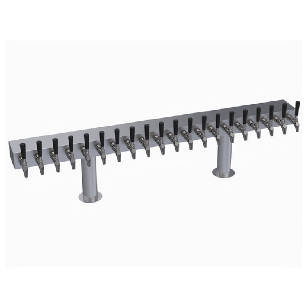 The Krowne KDTH-20S Krowne Double T-Head Tower is a specialized fixture designed for professional beverage dispensing systems, catering to the needs of bars, restaurants, and breweries. This product is distinguished by its capacity to support twenty faucets, providing high-volume service capability in busy environments. Measuring 60 inches in length, this tower is engineered for substantial service setups. Its glycol cooling system ensures beverages are dispensed at optimal temperatures, maintaining quality and customer satisfaction. The tower's exterior boasts a brushed stainless steel finish, combining durability with a sleek, modern aesthetic that complements any professional setting. It is important to note that handles and faucets are not included, allowing customization to match specific operational requirements. The Krowne KDTH-20S stands as a versatile solution in the beverage industry, adapting to the diverse demands of large-scale service operations with its robust construction and efficient cooling technology.