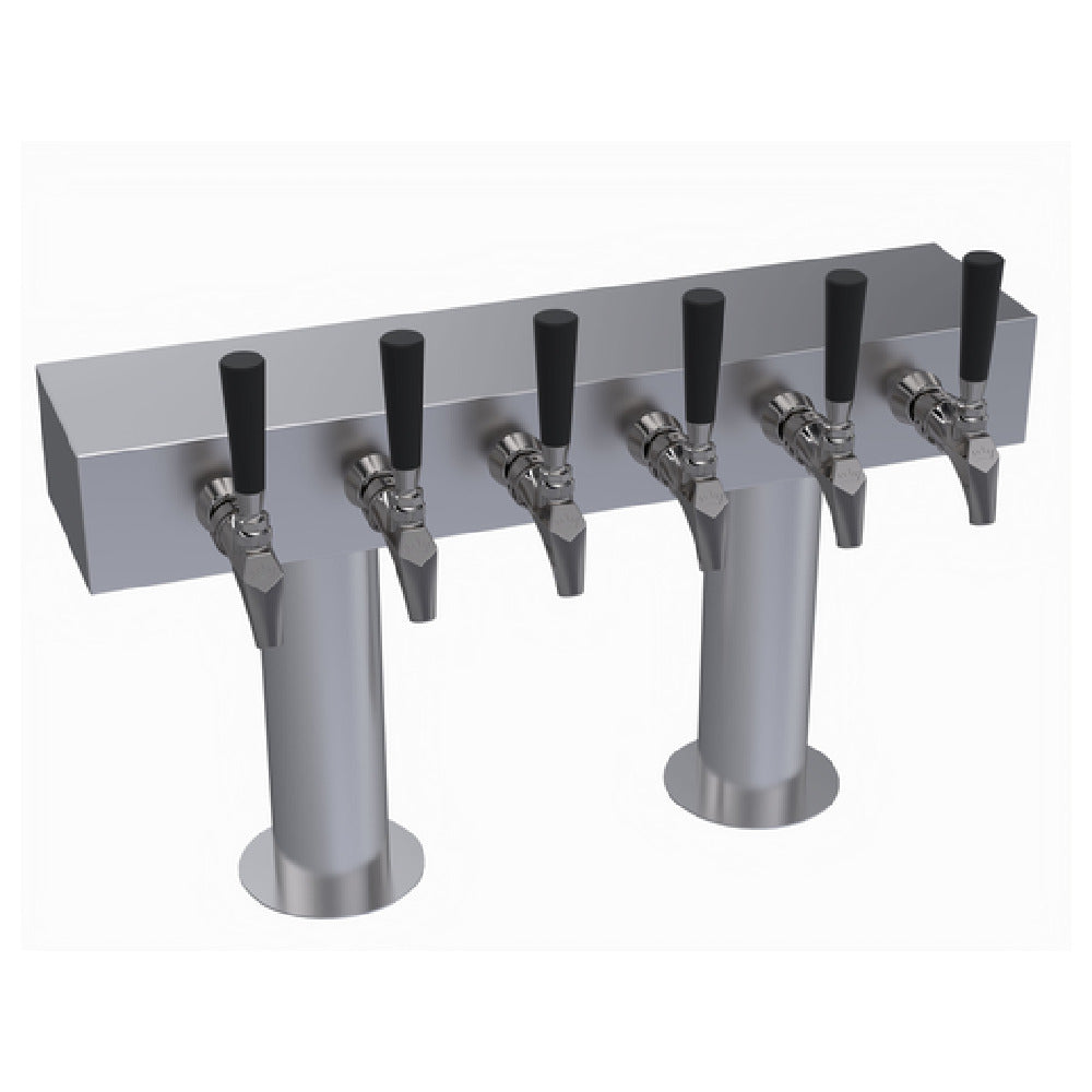 The Krowne KDTH-6S Krowne Double T-Head Tower is an expertly crafted piece designed for bar and beverage service environments, featuring six faucets for maximum efficiency. Constructed with a brushed stainless steel finish, it combines durability with a sleek aesthetic, making it a distinguished addition to any professional setting. This product is engineered with a 24-inch long box, providing ample space for installation without overwhelming the workspace. A notable feature is its glycol cooling system, which ensures optimal temperature maintenance for beverages, a crucial requirement for maintaining quality in high-demand settings. It is important to note that while the tower is equipped with six faucet positions, handles and faucets are not included, allowing for customizable options to suit specific operational needs. This flexibility caters to different market segments, from small-scale bars requiring specialized setups to larger venues needing efficient, high-capacity solutions. The design and build quality of the Krowne KDTH-6S underscore its reliability and adaptability in a variety of commercial applications, making it an essential component for establishments that prioritize both functionality and aesthetic appeal. This product stands out for its robust construction and thoughtful design, tailored to meet the diverse demands of the beverage service industry.