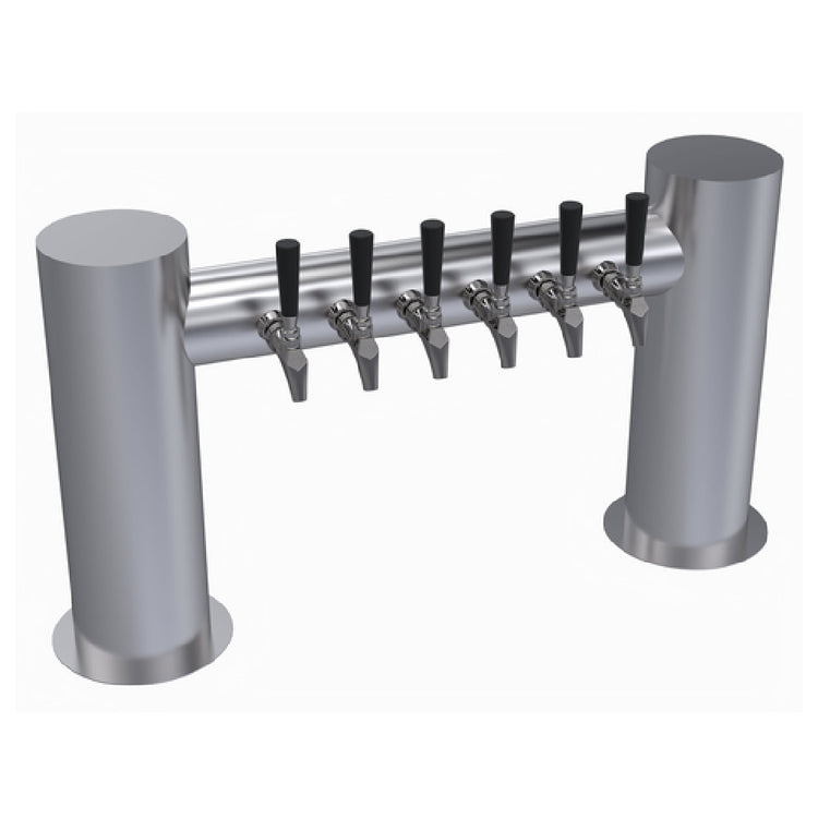 The Krowne KMH-6S Krowne Max-H Style Tower is a versatile and professional-grade unit designed for commercial settings requiring a high volume of beverage dispensing. Crafted with a brushed stainless steel finish, it exudes durability and a sleek aesthetic suitable for any bar or restaurant environment. The tower is engineered with six faucets, allowing for a diverse range of drink options to be served simultaneously, though it is important to note that handles and faucets are not included, enabling customization according to specific needs. A standout feature of this model is its glycol cooling system, ensuring that beverages are maintained at an optimal temperature for peak freshness. The tower measures 35 inches from outside flange to outside flange, offering ample space for efficient operations. This product is ideally suited for venues that prioritize not only functionality but also the flexibility to tailor their setup to fit unique operational requirements. The Krowne KMH-6S combines robust construction with practical design elements to serve the demanding needs of various sectors within the beverage industry, from high-traffic bars to specialized tasting rooms, while providing users with the opportunity to customize to their specific service demands.