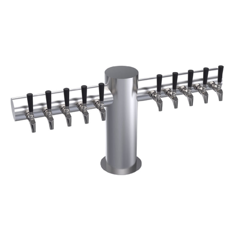 The Krowne KMT-10S Krowne Max-T Style Tower is a meticulously crafted piece designed for high-performance beverage dispensing in various commercial settings. This unit features ten faucets, providing a comprehensive solution for establishments that require multiple drink dispensation options. The handles and faucets are not included, allowing for customizable attachments to meet specific operational needs. The tower spans 39 inches from outside flange to outside flange, ensuring a substantial presence in any bar setup. Its glycol-cooled system maintains optimal beverage temperatures, making it ideal for environments where temperature control is crucial. The brushed stainless steel finish offers both durability and a sleek aesthetic, enhancing the visual appeal of any bar or restaurant. This product is particularly suitable for bars, restaurants, and event venues that demand high-capacity and efficient beverage service. The Krowne Max-T Style Tower's versatile design and robust construction make it a valuable addition to businesses aiming to deliver a diverse range of beverages efficiently. This tower serves as a reliable and stylish choice for professionals seeking a balance between functionality and modern design in their beverage dispensing systems.
