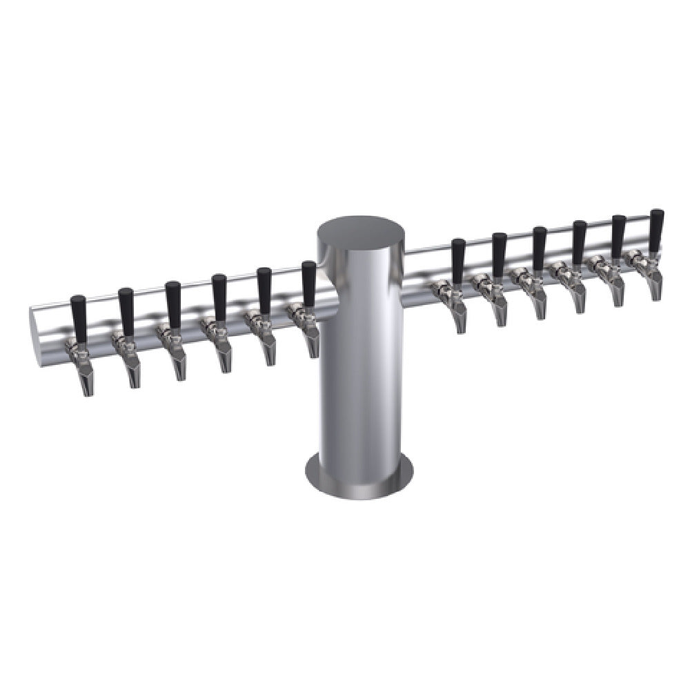 The Krowne KMT-12S Krowne Max-T Style Tower is a sophisticated solution for establishments requiring a high-capacity beverage dispensing system. This tower is designed to accommodate twelve faucets, providing substantial versatility for a wide variety of beverage offerings. However, it is important to note that handles and faucets are not included with this unit, allowing for customization according to specific needs. The tower spans 45 inches from outside flange to outside flange, ensuring a significant presence in any bar setup. Engineered for durability and aesthetic appeal, the tower features a brushed stainless steel finish, which complements modern bar décors while offering ease of maintenance. Additionally, the glycol cooling mechanism enhances performance by maintaining optimal beverage temperatures, making it an excellent choice for high-demand environments. This product is ideally suited for bars, restaurants, and venues requiring efficient and flexible beverage dispensing solutions. Its robust construction and efficient cooling technology ensure reliable service, making it a valuable addition to any professional setting. The Krowne Max-T Style Tower stands as a testament to quality engineering, designed to meet the diverse requirements of the hospitality industry.