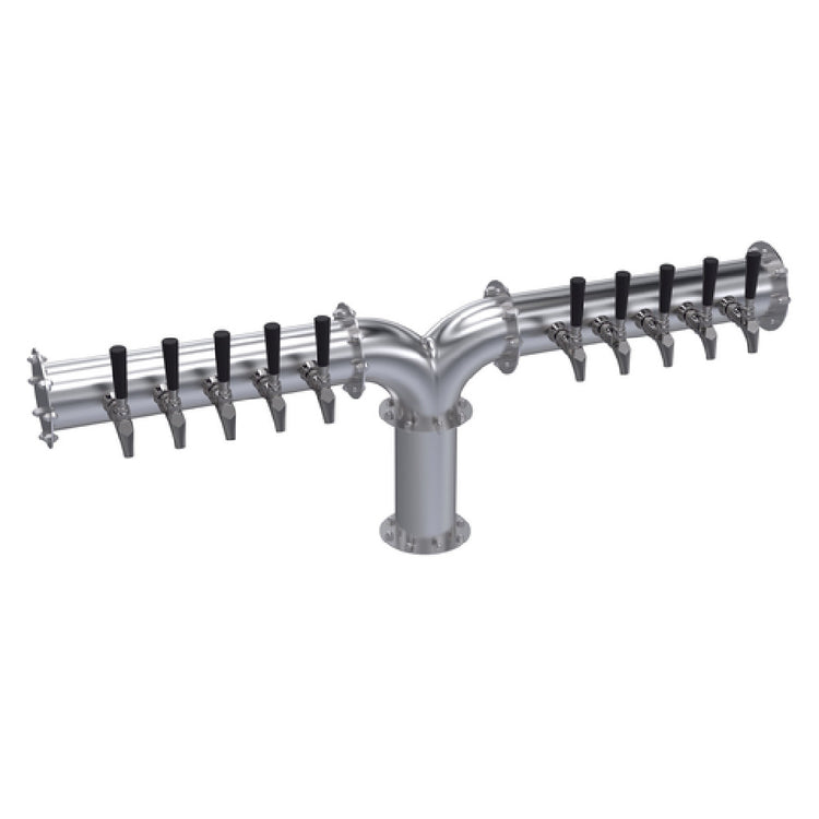 The Krowne KPY-10S Krowne Pipe Y-Tower is a distinguished product in the beverage dispensing industry, uniquely designed to cater to diverse market segments. Featuring an impressive array of ten faucets, this Y-Tower is an ideal choice for establishments demanding multiple beverage options. Notably, handles and faucets are not included, allowing for personalized customization to fit specific operational needs. The tower extends to a substantial 48 inches in overall length, providing ample space for efficient beverage distribution. Its glycol-cooled system ensures that beverages are served at optimal temperatures, enhancing consumer satisfaction. The tower's exterior is crafted from brushed stainless steel, offering a sleek, modern aesthetic that complements any bar or restaurant setting while ensuring long-lasting durability and resistance to wear and tear. This product is particularly valuable to businesses seeking to maximize beverage service capabilities without compromising on quality or style. The Krowne KPY-10S embodies a perfect blend of functionality and design, making it a versatile asset in any professional setting where beverage dispensing is a key aspect of service.