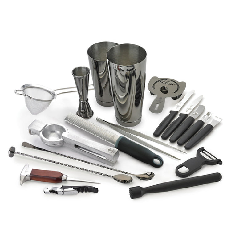 The Krowne KR-BK2 Krowne Deluxe Gun Metal Black 18-piece Cocktail Kit is an all-encompassing toolset designed to elevate the art of cocktail making in professional and home bar settings. This kit includes a comprehensive selection of bar accessories carefully crafted to meet the needs of mixologists and cocktail enthusiasts. It features a cocktail shaker set and a fine mesh strainer, both essential for creating smooth, flavorful beverages. The kit also includes 9-3/8-inch straight tongs and an 11-13/16-inch bar spoon with a muddler end, providing versatility for stirring and muddling ingredients. The spring bar strainer and 1oz x 2oz jigger ensure precise pouring and straining. Additionally, the 13-3/16-inch bar spoon is perfect for reaching the bottom of tall mixing glasses. The kit further includes a y-peeler, channel knife, and composite muddler for preparing garnishes and muddling fruits. An ice pick and cast aluminum juicer facilitate the preparation of fresh ingredients. Orange peeler, citrus zester, and a waiter's corkscrew are included for diverse bartending needs, while the 4-1/3-inch rounded tip, wavy edge bar knife and 4-inch pointed tip, plain edge bar knife, and narrow fine zester complete this well-rounded kit, making it an indispensable asset in the beverage industry.