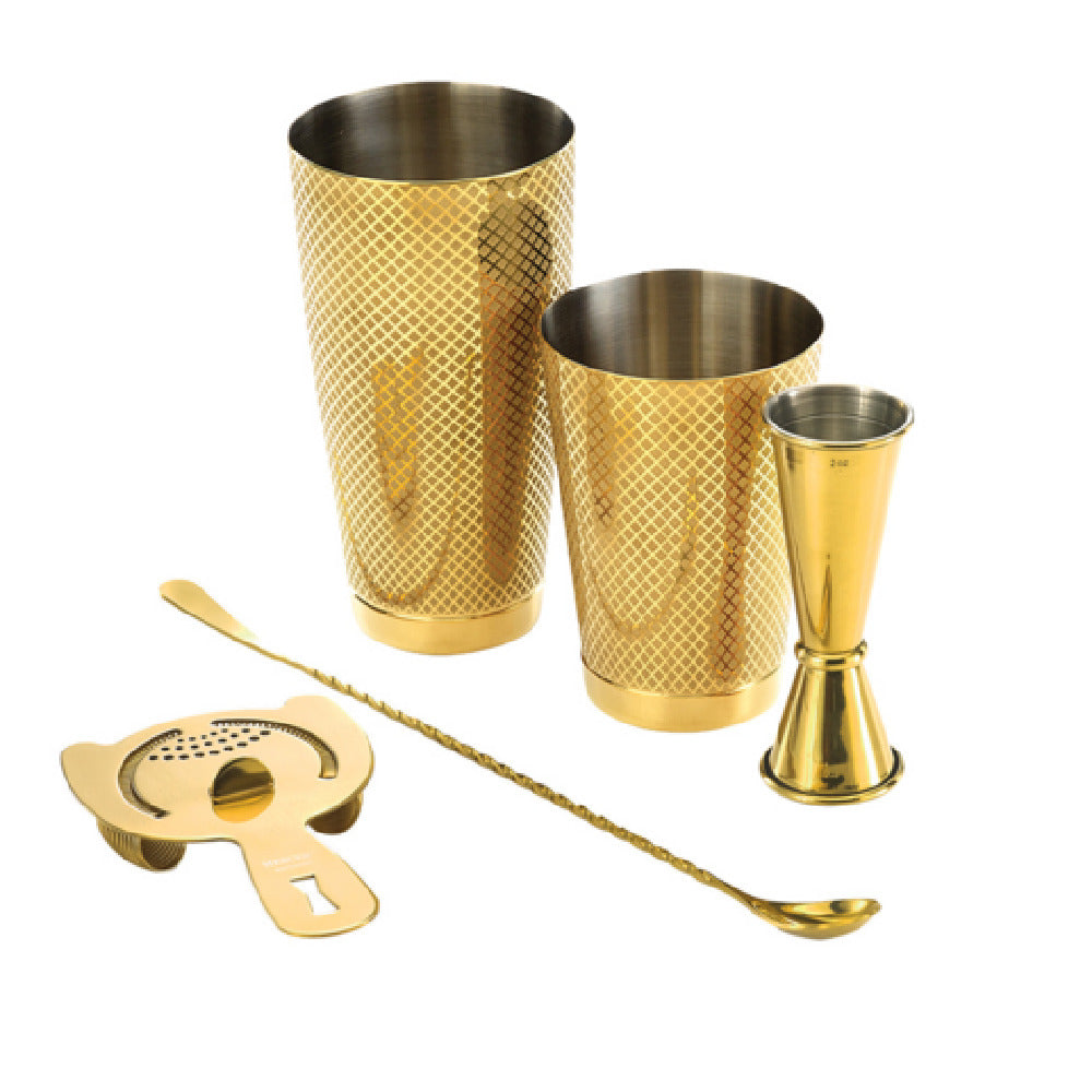 The Krowne KR-BK4 Krowne Basic Gold Lattice 5-Piece Cocktail Kit is a meticulously designed set that caters to both professional mixologists and home bartending enthusiasts. This comprehensive kit includes a full-sized shaker and a half-sized shaker, each crafted to facilitate a range of cocktail mixing techniques. The 1oz - 2oz jigger ensures precise measurement for consistent drink quality, making it an essential tool for crafting perfect cocktails. The 13-3/16" bar spoon features a long handle for seamless stirring in taller glasses and pitchers, enhancing the mixing process. Additionally, the spring bar strainer is included to ensure smooth, pulp-free pouring, further elevating the quality of each cocktail. This cocktail kit's unique gold lattice design adds an element of sophistication and style, making it not only functional but also an eye-catching addition to any bar setup. Whether used in a high-paced bar environment or a casual home setting, the Krowne KR-BK4 kit provides the essential tools needed for cocktail perfection, accommodating various market segments within the beverage industry. Its blend of aesthetic appeal and practical functionality makes it a valuable asset for anyone looking to refine their cocktail-making skills.