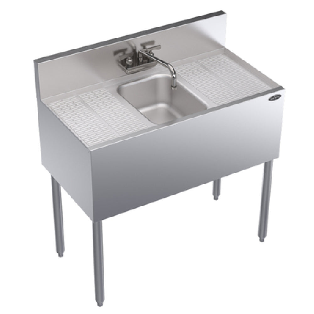 The Krowne KR19-31C Royal Series Underbar Sink Unit is a meticulously engineered one-compartment solution measuring 36"W x 19"D, specifically designed for efficient operation in the food and beverage industry. This unit features a 10" wide x 14" front-to-back x 10" deep compartment, providing ample space for various tasks. It is equipped with 12" embossed integral drainboards on both the left and right sides, ensuring optimal drainage and workspace organization. The inclusion of a splash mount Royal Series faucet enhances its usability, while the apron on the front and sides adds to its structural integrity and aesthetic appeal. Additionally, this unit comes with a removable overflow standpipe, a practical feature for preventing overflows. Constructed with a stainless steel top, front, and sides, it offers durability and resistance to corrosion, essential for high-demand environments. The stainless steel legs with adjustable thermoplastic bullet feet provide stability and allow for height adjustments, ensuring the unit can be tailored to various settings. Certified by NSF, this underbar sink unit meets rigorous public health and safety standards, making it a reliable choice in professional settings where efficiency and compliance are paramount.