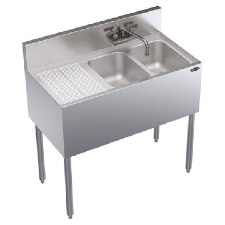 The Krowne KR19-32R Royal Series Underbar Sink Unit Two Compartment 36"W X 19"D is a meticulously designed piece tailored for efficient use in professional bar settings and hospitality environments. This unit features two compartments, each measuring 10" wide, 14" front-to-back, and 10" deep, catering to various washing and rinsing needs. Its 12" embossed integral drainboard on the left enhances functionality by providing a dedicated space for drying. The apron on the front and sides ensures durability and a sleek appearance. Equipped with a splash mount Royal Series faucet with a swing spout, it is low lead compliant, meeting industry standards for safety and usability. The inclusion of two removable overflow standpipes offers flexibility and convenience in water management. Constructed with a stainless steel top, front, and sides, and supported by stainless steel legs with adjustable thermoplastic bullet feet, this sink unit offers robust construction and stability. Certified by NSF, the Krowne KR19-32R guarantees adherence to public health and safety standards, making it an invaluable addition to any underbar setup. Its combination of practicality, compliance, and aesthetic appeal make it a versatile choice for the food service industry.