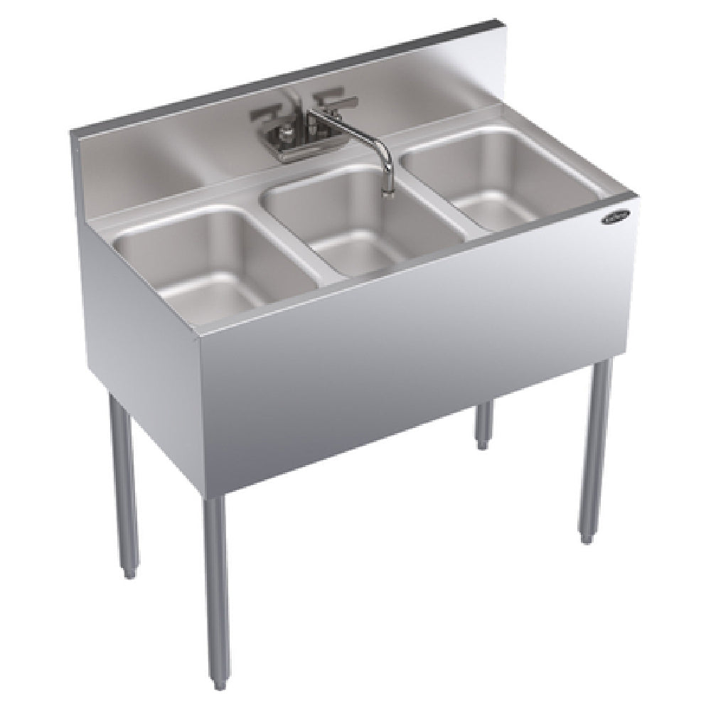 The Krowne KR19-33C Royal Series Underbar Sink Unit is expertly crafted for high-demand commercial environments, boasting three spacious compartments each measuring 10" wide x 14" front-to-back x 10" deep. At 36"W x 19"D, this unit is designed for efficient use of space in underbar settings. It features a splash mount Royal Series faucet with a convenient swing spout, ensuring ease of use and optimal water flow control. The inclusion of three removable overflow standpipes enhances the versatility and functionality of the sink, allowing for efficient water management and overflow prevention. Constructed with a stainless steel top, front, and sides, this unit offers exceptional durability and resistance to corrosion, ensuring long-lasting performance in busy environments. The stainless steel legs come with adjustable thermoplastic bullet feet, providing stability and adaptability to varying floor surfaces. The front and sides are equipped with an apron, adding to the robust design. Certified by NSF, this sink unit meets high standards for public health and safety, making it a reliable choice for bars, restaurants, and hospitality venues seeking quality and functionality in their underbar installations.