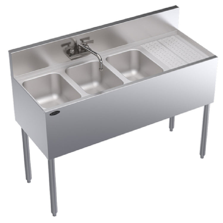 The Krowne KR19-43L Royal Series Underbar Sink Unit is a highly functional and efficient stainless steel sink designed for commercial use in various segments of the food and beverage industry. Featuring a three-compartment design, this unit measures 48 inches in width and 19 inches in depth. Each of the three compartments is 10 inches wide, 14 inches front-to-back, and 10 inches deep, providing ample space for washing, rinsing, and sanitizing tasks. A 12-inch embossed integral drainboard on the right side enhances its practicality, allowing for convenient drying and temporary storage of kitchen utensils. The splash mount Royal Series faucet with a swing spout is low lead compliant, ensuring safety and sustainability in water usage. The sink unit is equipped with an apron on the front and sides for additional support and rigidity. It includes three removable overflow standpipes, facilitating seamless maintenance and hygiene. Supported by sturdy stainless steel legs with adjustable thermoplastic bullet feet, the unit ensures stability and adaptability to uneven surfaces. As an NSF-certified product, this underbar sink unit meets the highest standards of safety and sanitation, making it a reliable choice for bars, restaurants, and other food service establishments that require dependable and durable sink solutions.