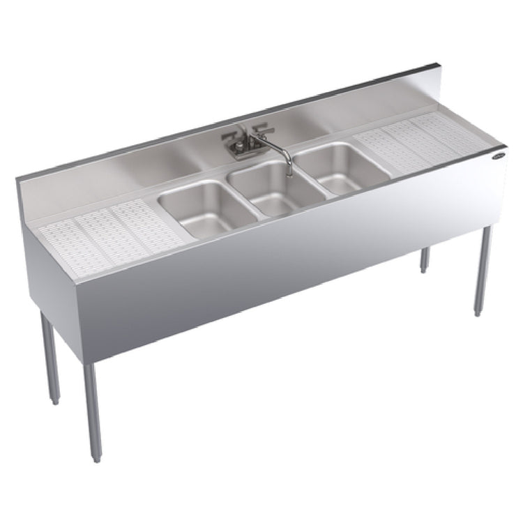 The Krowne KR19-63C Royal Series Underbar Sink Unit is a versatile, high-quality addition to any professional bar or restaurant setting. It features three spacious compartments, each measuring 10 inches wide, 14 inches front-to-back, and 10 inches deep, providing ample space for efficient cleaning and washing tasks. At 72 inches in width and 19 inches in depth, this unit is designed to fit compactly under a bar counter while still offering extensive functionality. The unit includes 18-inch embossed integral drainboards on both the left and right sides, optimizing space for drying and organizing. Equipped with a splash mount Royal Series faucet with a swing spout, it ensures easy access and maneuverability. The front and sides are fitted with aprons for added protection and durability. The sink unit also includes three removable overflow standpipes, contributing to seamless maintenance and operation. Constructed with a stainless steel top, front, and sides, along with stainless steel legs and adjustable thermoplastic bullet feet, this unit promises longevity and stability. Certified by NSF, it meets stringent health and safety standards. The Krowne KR19-63C is a practical and reliable choice, balancing form and function for diverse commercial environments.