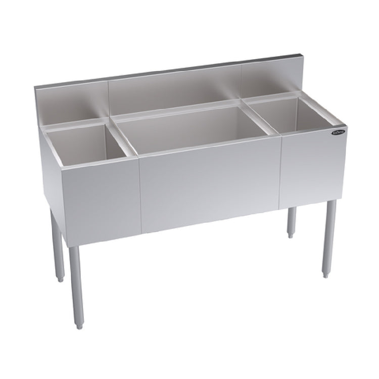 The Krowne KR19-M48C Royal Series Underbar Combination Ice Bin is a meticulously designed fixture, ideal for businesses that require efficient and versatile underbar solutions. Measuring 48 inches in width and 19 inches in depth overall, this unit features a central 24-inch-wide ice bin capable of holding up to 74 pounds of ice, making it suitable for high-demand environments. The combination design includes two 12-inch-wide insulated bottle storage units on each end, providing ample space for a variety of bottled beverages, enhancing operational efficiency. Engineered with premium stainless steel on the top, front, and sides, this ice bin ensures durability and easy maintenance. The stainless steel legs are equipped with adjustable thermoplastic bullet feet, allowing for a stable and level placement even on uneven surfaces. Certified by NSF, this product adheres to strict health and safety standards, making it an excellent choice for bars, restaurants, and hospitality venues that prioritize quality and compliance. The Krowne KR19-M48C Royal Series stands out as a reliable and practical addition to any professional setting that demands both performance and aesthetics.
