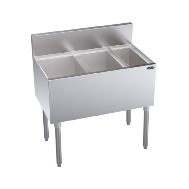 The Krowne KR19-MS32L-10 Royal Series Underbar Speed Multi Station with built-in 10-circuit cold plate is a highly efficient unit designed to meet the demands of commercial bar environments. With an overall size of 32 inches, it incorporates a 24-inch ice bin positioned on the left side, offering ample storage for ice. The station features an 8-inch insulated bottle well, capable of holding up to 10 elixir bottles, although bottles are not included. For optimal functionality, it includes a 1/2-inch drain and a 3/4-inch x 3-1/2-inch soda line cut out in the backsplash, facilitating seamless integration with beverage systems. The construction is robust and durable, with the top, front, and sides made from stainless steel, complemented by stainless steel legs equipped with adjustable thermoplastic bullet feet. This enhances stability and allows for height customization to fit various setups. The station is ETL-Sanitation and NSF certified, ensuring it meets rigorous health and safety standards. The Krowne KR19-MS32L-10 is an ideal solution for bars and restaurants looking to streamline service efficiency with its practical design and high-quality materials, tailored to maintain operational standards in high-volume settings.