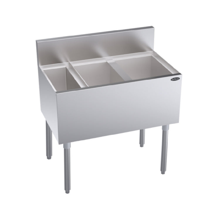 The Krowne KR19-MS32R-10 Royal Series Underbar Speed Multi Station with built-in 10-circuit cold plate stands out as a versatile solution for the food and beverage industry, offering a comprehensive range of features that cater to efficiency and convenience. This unit measures 32" in overall size and incorporates a 24" ice bin positioned on the right, alongside an 8" insulated bottle well that accommodates up to 10 elixir bottles, though bottles are not included. It features a 1/2" drain, ensuring effective waste management, and a 3/4" x 3-1/2" soda line cut-out located in the backsplash for streamlined beverage operations. The entire structure, including the top, front, and sides, is crafted from stainless steel, providing both durability and a sleek professional appearance. The stainless steel legs, equipped with adjustable thermoplastic bullet feet, add to the robustness and adaptability of this unit. This multi station is ETL-Sanitation and NSF certified, underscoring its compliance with rigorous sanitation and safety standards. The Krowne KR19-MS32R-10 is an exceptional choice for busy bars and restaurants that require quick service and efficient use of underbar space, combining practicality with high-quality construction.