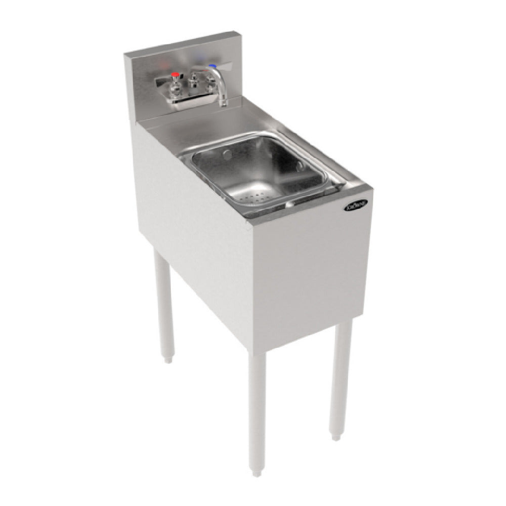 The Krowne KR24-12DS Royal Series Underbar Dump Sink is a freestanding unit designed for optimal utility in fast-paced bar environments. With dimensions of 12"W x 24"D x 36-1/2"H.O.A., this sink is tailored to match speedrail depth, making it a seamless addition to your existing setup. The sink features a 10"W x 14"D front-to-back x 7" deep bowl, complete with a practical plastic perforated basket that aids in efficient waste management. Its splash mount Royal Series faucet ensures reliable performance, meeting high standards of durability and hygiene. Constructed with a stainless steel top, front, and sides, this underbar sink is not only robust but also easy to clean. The stainless steel legs come with adjustable thermoplastic bullet feet, allowing for stability on uneven surfaces. NSF certification highlights its compliance with health and safety standards, making it ideal for both commercial bars and restaurants that prioritize quality and efficiency. The Krowne KR24-12DS Royal Series Underbar Dump Sink stands out for its thoughtful design and precise engineering, addressing the needs of different segments within the hospitality industry looking for dependable, space-efficient solutions.