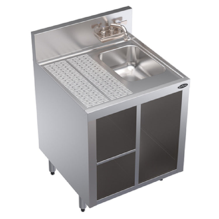 The Krowne KR24-24SC Royal Series Underbar Wet Waste Cabinet - Open Front Cabinet Base - is a highly specialized unit designed for efficient waste management and organization in hospitality environments. Measuring 24 inches wide by 24 inches deep, this cabinet offers a compact yet functional design suitable for various commercial applications. It features a 10-inch wide by 14-inch front-to-back by 6-inch deep sink positioned on the right, complemented by a splash mount Royal Series faucet, ensuring seamless water flow for cleaning and waste disposal tasks. An embossed drainboard is strategically placed on the left side, providing a practical surface for drying or temporary placement of wet items. The robust construction includes a stainless steel top, front, and sides, promising durability and resistance to corrosion, while the galvanized steel back and bottom add structural strength. Stainless steel legs with adjustable grey plastic bullet feet offer stability and adaptability on uneven surfaces. This product meets NSF standards, reassuring users of its compliance with health and safety regulations. The Krowne KR24-24SC is a valuable asset for bars, restaurants, and other food service environments looking for reliable and efficient underbar storage solutions.