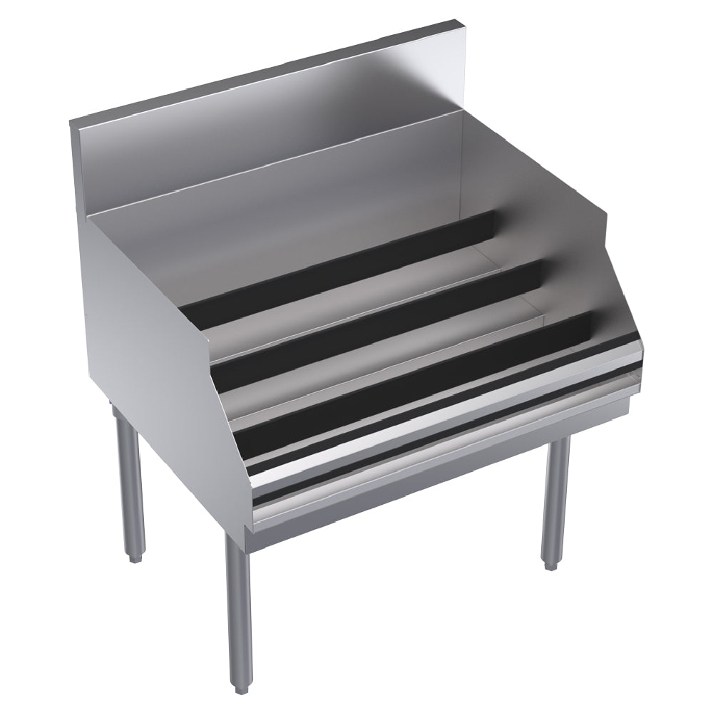 The Krowne KR24-30RD Royal Series Underbar Liquor Bottle Display Unit Freestanding is a meticulously designed piece of equipment tailored for efficiency and organization in commercial bar settings. Measuring 30 inches in width and 24 inches in depth, this unit is specifically crafted to align with the depth of a speed rail, ensuring seamless integration into existing bar setups. It boasts the capacity to hold 36 liquor bottles, distributed across four bottle steps, providing a structured display that enhances accessibility and presentation. Each step is equipped with guard rails, adding an extra layer of security to prevent accidental falls. Constructed with a stainless steel top, front, and sides, the unit not only showcases a sleek and modern aesthetic but also offers robust durability and easy maintenance. Completing its sturdy build are stainless steel legs, fitted with adjustable thermoplastic bullet feet to ensure stability on uneven surfaces. This unit is ideal for bars and restaurants looking to optimize space while maintaining an elegant liquor display, merging practicality with style. Its freestanding nature allows for flexible placement, making it a versatile addition to any hospitality environment where showcasing an extensive selection of spirits is a priority.