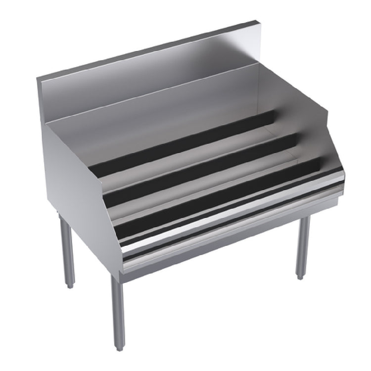 The Krowne KR24-36RD Royal Series Underbar Liquor Bottle Display Unit is a meticulously designed freestanding fixture, ideal for high-demand bar environments seeking efficiency and style. This unit measures 36 inches in width and 24 inches in depth, aligning perfectly with standard speedrail depths, ensuring seamless integration into your bar setup. It boasts an impressive capacity, accommodating up to 44 liquor bottles across its four bottle steps. Each step is equipped with guard rails, ensuring the safety and stability of your displayed bottles. Constructed with a stainless steel top, front, and sides, this unit not only promises durability but also an easy-to-clean surface that maintains its sleek appearance over time. The stainless steel legs are supported by adjustable thermoplastic bullet feet, providing stability on uneven surfaces and ensuring the unit remains level. The KR24-36RD is a versatile asset for various segment markets within the hospitality industry, from upscale bars to busy restaurants, offering an elegant solution for efficient liquor storage and display. Its robust construction and thoughtful design facilitate a streamlined workflow and enhance the visual appeal of your service area, making it an essential component in professional bar setups.