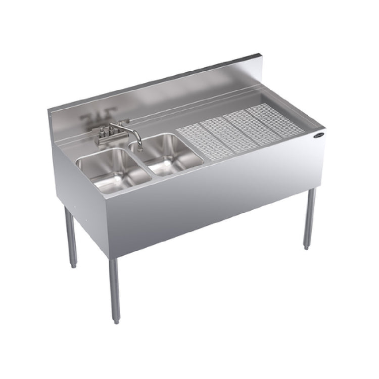 The Krowne KR24-42L Royal Series Underbar Sink Unit is a meticulously designed two-compartment sink, measuring 48 inches in width and 24 inches in depth. Each compartment is 10 inches wide, 14 inches front-to-back, and 10 inches deep, providing ample space for various washing tasks in food service settings. It features a 24-inch embossed drainboard on the right side, ideal for drying and organizing washed items. The unit boasts a deck mount Royal Series faucet with a swing spout, adding flexibility and ease of use. Its design includes an apron on the front and sides, contributing to its sleek and professional appearance. For enhanced functionality, the sink unit comes with two removable overflow standpipes, facilitating efficient drainage. Constructed from stainless steel on the top, front, and sides, it ensures durability and longevity in demanding environments. The sink rests on stainless steel legs equipped with adjustable thermoplastic bullet feet, allowing for stability on uneven surfaces. Certified by NSF, this underbar sink unit meets rigorous public health and safety standards, making it a reliable choice for bars, restaurants, and other commercial establishments needing efficient and space-saving washing solutions.