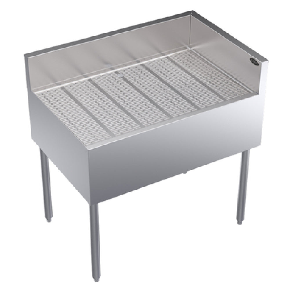 The Krowne KR24-C36R Royal Series Underbar Corner Drainboard Free Standing 36"W x 24"D x 36-1/2"H O.A. is a meticulously engineered piece for establishments that require efficient underbar configurations. With a precise width of 36 inches and a depth of 24 inches, it comfortably fits into corner spaces, maximizing utility in compact areas. Standing at an overall height of 36-1/2 inches, it is designed to integrate seamlessly into bar environments, supporting ease of use and accessibility. The right end return feature adds to its versatility, allowing for flexible arrangement within existing setups. The embossed top with a 1-inch drain ensures effective water management and cleanliness—essential for high-traffic bar operations. Crafted from stainless steel, the top, front, and sides provide durability and a sleek, professional appearance. Its structure is supported by stainless steel legs, which include adjustable thermoplastic bullet feet for stability on uneven surfaces. This product meets NSF standards, ensuring it adheres to strict public health and safety guidelines. The Krowne KR24-C36R is an invaluable addition for bars and restaurants, offering the reliability and hygiene standards necessary for successful beverage service operations.