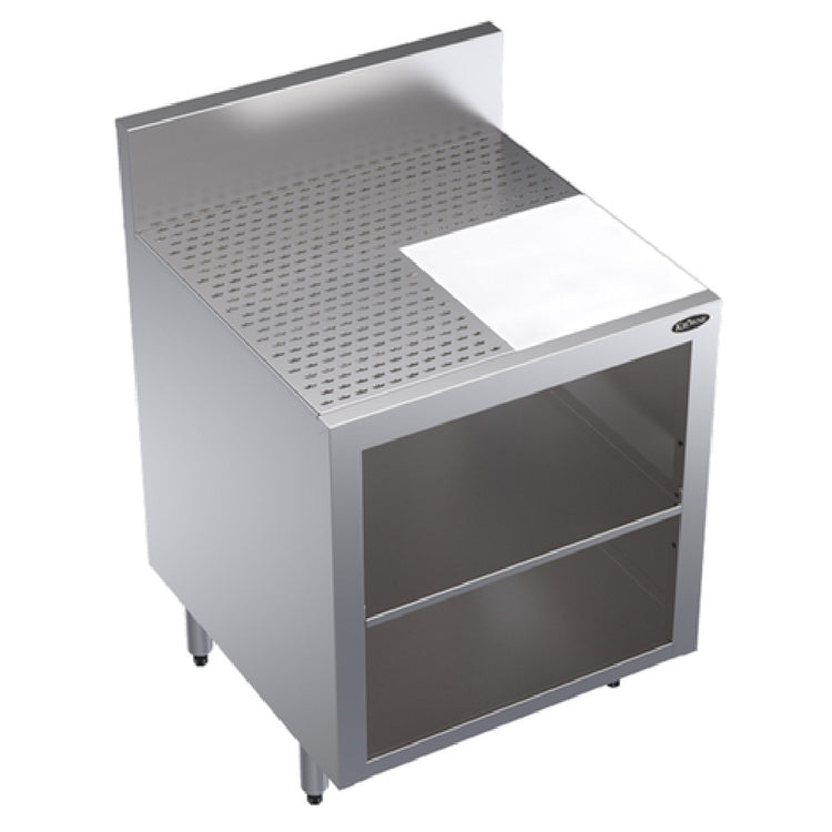 The Krowne KR24-GSB4 Royal Series Underbar Glass Rack Storage Unit is a compact and efficient storage solution, with dimensions of 24"W x 24"D, tailored for professional bar setups and commercial kitchens that require organized glassware storage. This unit features a flat top with removable perforated inserts, allowing for versatile usage and easy maintenance. Additionally, it includes a 12" x 12" cutting board, enhancing its functionality in fast-paced environments. The open front design with an intermediate shelf provides accessible storage, accommodating two 20" x 20" glass racks (not included), optimizing space for glassware management. Equipped with a 1" drain, this unit ensures effective water management, supporting cleanliness and efficiency. The Krowne KR24-GSB4 is crafted with a stainless steel top, front, and sides, offering durability and resistance to corrosion, while the galvanized steel back and bottom provide structural strength. The stainless steel legs are fitted with adjustable thermoplastic bullet feet, allowing for stabilization on uneven surfaces. Certified by NSF, this unit adheres to strict public health and safety standards, making it a reliable choice for businesses seeking quality and compliance. This product is a strategic investment for bars, restaurants, and hospitality venues aiming for streamlined operations and optimal glassware storage.