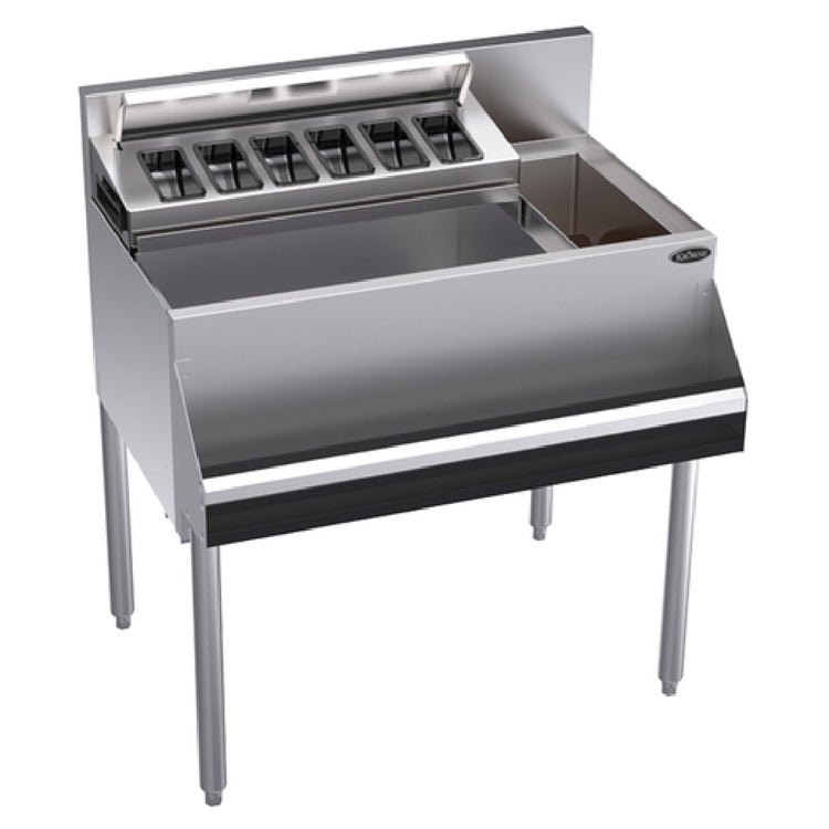 The Krowne KR24-MS32L-10 Royal Series 8" Elixir Mixology Multi-Station Built-in 10-circuit Cold Plate is a premium solution designed for professional mixologists and bar setups. With a comprehensive width of 32" and an ice bin situated on the left capable of holding up to 74 lbs. of ice, this station ensures efficient and seamless operations. The ice bin is enhanced with an ice bin divider, while the removable garnish station is cleverly integrated with a cover, supporting up to six garnish cups for quick access. The insulated bottle well accommodates ten elixir bottles and nine liquor bottles, although the bottles are not included. A built-in speed rail facilitates rapid service, and an efficient 1/2" drain ensures cleanliness and sanitation. Certified by NSF and ETL-Sanitation, this unit adheres to stringent health and safety standards. The Krowne Royal Series is ideal for bars and restaurants seeking an organized, high-capacity station that prioritizes both functionality and cleanliness.