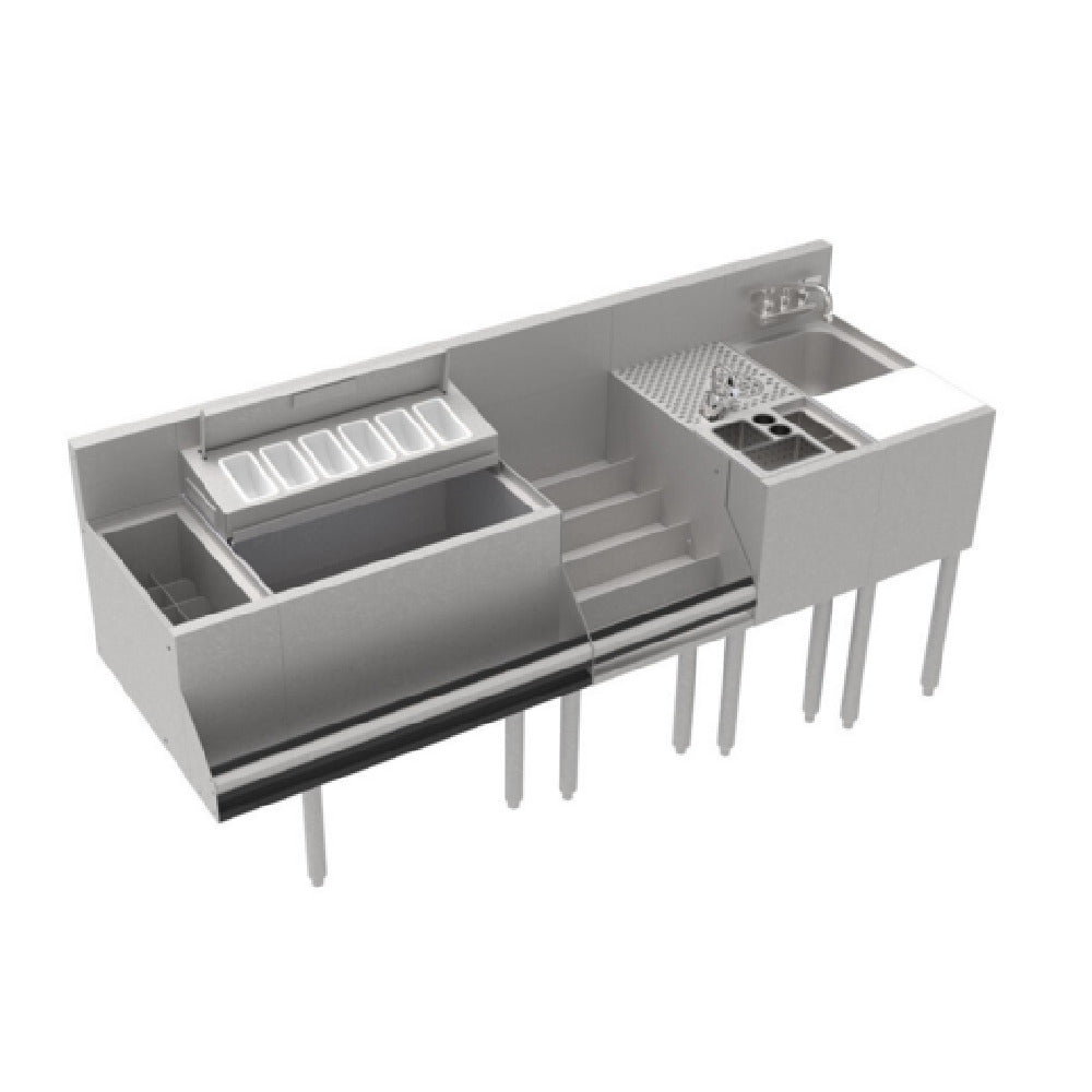 The Krowne KR24-MT72 Royal Series 72” Workstation With 8” Elixir Well 24” Ice Bin (no Cold Plate) with Garnish Cover is a meticulously designed bar and beverage station, tailored for high-efficiency service environments. This comprehensive workstation features a 72-inch unit equipped with an 8-inch elixir well, ideal for storing and showcasing mixers or special concoctions. It includes a substantial 24-inch ice bin, although note that this model does not incorporate a cold plate. An added garnish cover ensures hygiene and ease of access to ingredients. Complementing the elixir well and ice bin are a 16-inch liquor shelf, perfect for organizing and displaying a variety of spirits, and a 12-inch tool caddy that provides convenient storage space for bar tools. Additionally, the unit includes a 12-inch dump sink with an accompanying cutting board, enhancing preparation efficiency. A cabinet below offers further practical storage capabilities, making this workstation a versatile addition to any hospitality or food service venue. Its thoughtful design caters to the varied needs of bartenders and service staff, supporting streamlined operations in both busy bars and upscale restaurant environments.