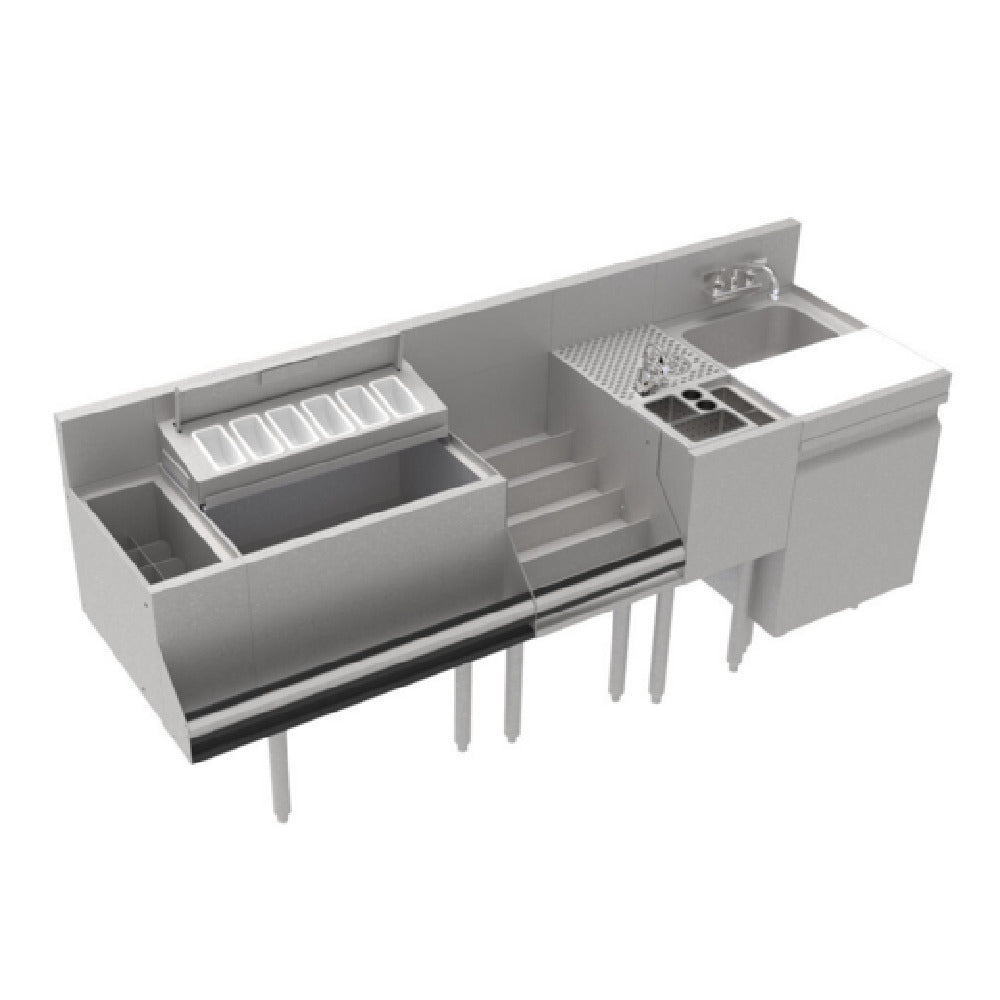 The Krowne KR24-MT78 Royal Series 78” Workstation With 8” Elixir Well 24” Ice Bin (no Cold Plate) with Garnish Cover is a meticulously crafted unit for professional settings requiring precise beverage preparation and organization. Measuring 78 inches, this workstation integrates an 8-inch elixir well, facilitating efficient mixing and serving of drinks. It features a 24-inch ice bin, optimized for storage without the use of a cold plate, maintaining simplicity and functionality. The inclusion of a garnish cover ensures freshness and accessibility of drink accompaniments. This unit also includes a 16-inch liquor compartment and a 12-inch tool caddy for orderly storage of essential bartending tools. Further enhancing its utility, the workstation is equipped with an 18-inch dump sink, accompanied by a cutting board and trash chute, promoting cleanliness and efficiency. A cabinet below the workstation provides additional storage space, enhancing organization and accessibility. Ideal for hospitality environments, this Krowne workstation combines robust features and a streamlined design to support high-volume operations in bars, restaurants, and event venues, ensuring a professional and efficient workflow.
