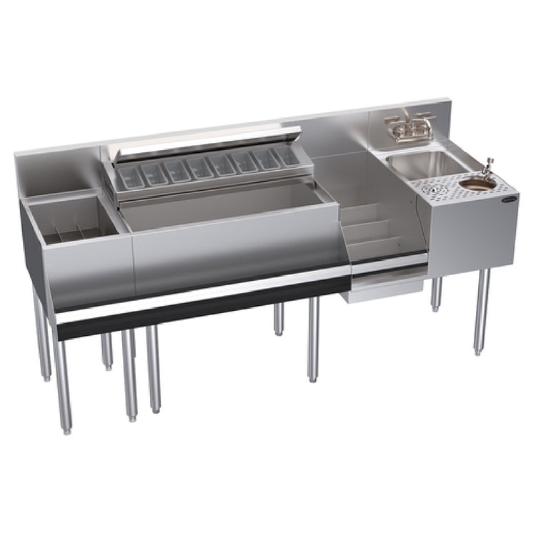 The Krowne KR24-MX68A-10 Krowne Zero-Step Workstation is a versatile and efficient unit designed for optimal functionality in high-demand environments. Measuring 68"W x 24" deep and standing at an overall height of 36-1/2", this workstation is built to accommodate a range of professional needs. It features a 12"W insulated bottle section, a 30"W ice bin that is 12" deep with a built-in 10 circuit cold plate, and includes two ice bin dividers for organized storage. The workstation also comes equipped with a garnish tray and sliding cover, alongside a 12"W five-step liquor display for streamlined access to spirits. Additionally, it features a 14" dump sink with an integrated glass rinser and tool caddy, complete with a pressure regulator. The 42" sound-deadened single speedrail ensures quieter operation, while the stainless steel top, front, and sides contribute to its robust construction. Supported by stainless steel legs with adjustable thermoplastic bullet feet, this unit reflects a commitment to durability and practicality. NSF certification underscores its adherence to public health standards, making it an ideal choice for bars, restaurants, and other commercial establishments seeking high-quality, reliable equipment.