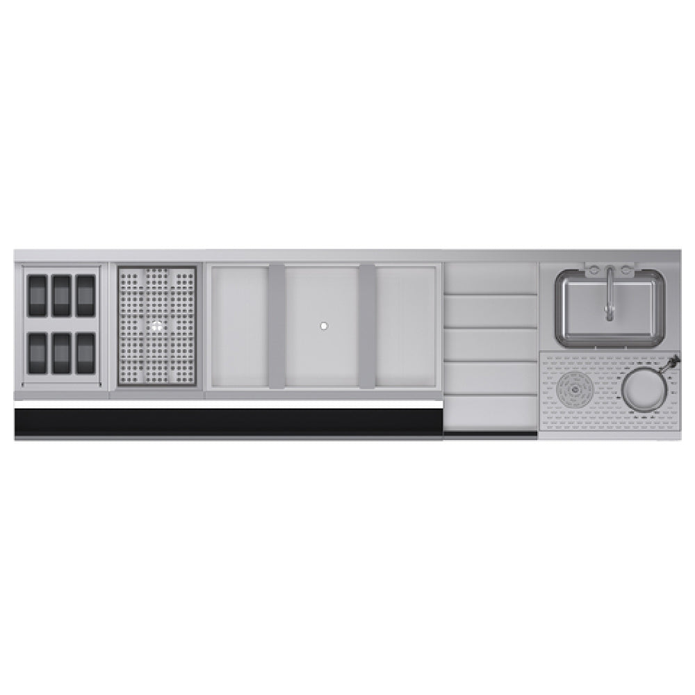 The Krowne KR24-MX84-10 Royal Series Single Zero-Step Speed Station With 10-circuit Cold Plate is a versatile addition to any commercial bar setup, measuring 84"W x 24"D with an overall height of 36-1/2". This high-performance station features a 12"W insulated garnish section and a 12" insulated bottle section for optimal storage. The centerpiece is a 30"W ice bin equipped with a 10-circuit cold plate, complete with two dividers for organized ice distribution. Additionally, it includes a 12"W five-step liquor display and an 18" dump sink with an integrated glass rinser and tool caddy, enhanced with an included pressure regulator. The station is designed with a 54" sound-deadened single speedrail, providing a quiet and efficient service area. Constructed from durable stainless steel for the top, front, and sides, it stands securely on stainless steel legs with adjustable thermoplastic bullet feet, guaranteeing stability on various surfaces. This product is NSF certified, ensuring compliance with public health standards, making it an ideal choice for high-demand environments in the food and beverage industry.