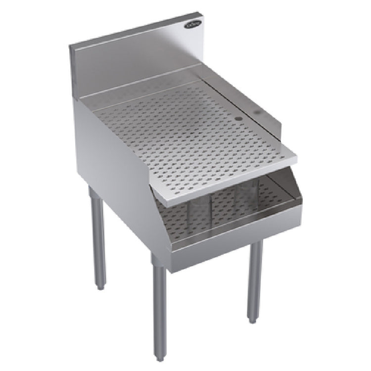 The Krowne KR24-RG18 Royal Series Underbar Recessed Drainboard is a versatile and essential fixture designed for commercial bar environments, offering a freestanding structure with dimensions of 18 inches in width and 24 inches in depth. This product features a removable perforated drainboard insert, providing ease of cleaning and maintenance. Constructed with a high-quality stainless steel top, front, and sides, the drainboard ensures durability and longevity, making it suitable for busy bar settings. The stainless steel legs come with adjustable thermoplastic bullet feet, allowing for stable installation on uneven surfaces. This unit is NSF certified, signifying its adherence to strict public health and safety standards, making it a reliable option for enterprises such as restaurants, pubs, and hotels. The Krowne KR24-RG18 is engineered to support efficient water drainage, reduce cleanup time, and maintain hygiene standards, thereby enhancing operational efficiency in high-traffic areas. Its sleek design and robust construction make it an ideal choice for establishments seeking a dependable solution to streamline their beverage service operations. This drainboard stands out in the market due to its blend of functionality, durability, and compliance with industry regulations, catering to the diverse needs of various service sectors.