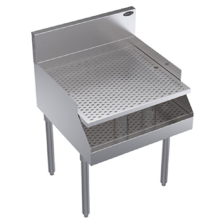 The Krowne KR24-RG24 Royal Series Underbar Recessed Drainboard is a meticulously engineered free-standing unit, measuring 24 inches wide by 24 inches deep, specifically designed to enhance efficiency in bar and restaurant settings. This model features a removable perforated drainboard insert, facilitating easy cleaning and maintenance while ensuring optimal drainage. Constructed with a stainless steel top, front, and sides, the drainboard boasts robust durability and a sleek appearance, making it a stylish and practical addition to any commercial environment. The stainless steel legs are equipped with adjustable thermoplastic bullet feet, providing stability on uneven surfaces and allowing for customizable height adjustments. NSF certification confirms its adherence to stringent public health and safety standards, ensuring it is a reliable choice for food service professionals. The Krowne KR24-RG24 is an exceptional choice for businesses seeking a high-quality, versatile underbar solution to streamline operations and maximize workspace efficiency. Its thoughtful design caters to the specific needs of bars, cafes, and restaurants, making it an indispensable tool for professionals who prioritize cleanliness, durability, and performance in demanding service environments.