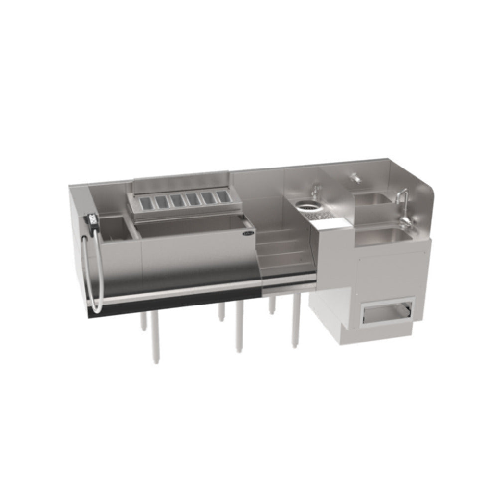 The Krowne KR24-TCS70A-10 The Taffer Command Station By Krowne is a meticulously designed unit measuring 70"W x 24" deep x 36-1/2" overall height. This command station is engineered for efficiency and versatility in the hospitality industry. On the left, it features a 4" soda gun holder, while an 8"W insulated bottle section and a 24"W ice bin are centrally located, complete with a 15" deep liner and a built-in 10 circuit cold plate. The unit includes an ice bin divider and a garnish tray/sliding cover. On the right, an 8"W five-step liquor display and an 8" speed station with a non-slip cutting board, rinser, and tool well with faucet (pressure regulator included) enhance functionality. The 18" Hybrid Hand/Dump Sink integrates a soap and paper towel dispenser for added convenience. A 36" sound-deadened single speedrail is included, ensuring noise reduction in high-traffic environments. The station showcases a stainless steel top, front, and sides, with stainless steel legs featuring adjustable thermoplastic bullet feet for stability. NSF certification underscores its adherence to safety standards. This command station is ideal for bars, restaurants, and catering services requiring a comprehensive, durable, and efficient solution.