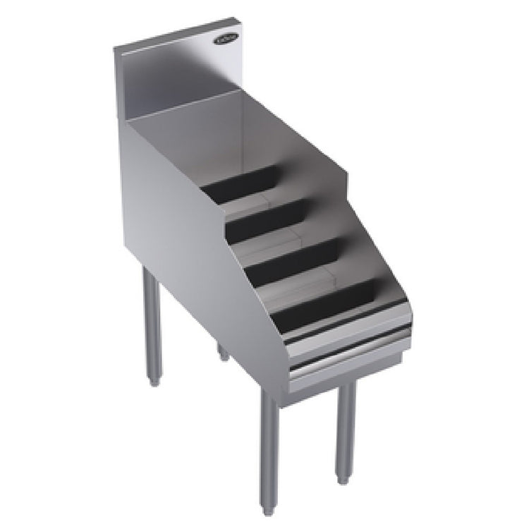 The Krowne KR29-12RD Royal Series Underbar Liquor Bottle Display Unit - Freestanding is a meticulously crafted display solution designed to enhance bar efficiency and presentation. Measuring 12 inches in width and 29 inches in depth, its structure aligns perfectly with the double speedrail depth, offering a seamless integration into existing bar setups. This unit can accommodate up to 15 liquor bottles, expertly organized across five bottle steps with protective side splashes to prevent spillage and ensure orderliness. Its construction features a durable stainless steel top, front, and sides, which are complemented by a galvanized steel back and bottom, ensuring longevity and resistance to wear in demanding environments. The stainless steel legs are equipped with adjustable thermoplastic bullet feet, providing stability on uneven surfaces. The NSF certification highlights its compliance with strict public health standards, making it a reliable choice for bars, restaurants, and hospitality venues seeking efficient and attractive bottle display solutions. This unit serves as a valuable asset for establishments focused on optimizing space and enhancing their beverage service capabilities, underscoring Krowne's commitment to quality and functional design in the bar equipment sector.